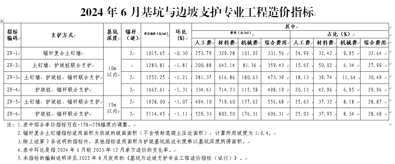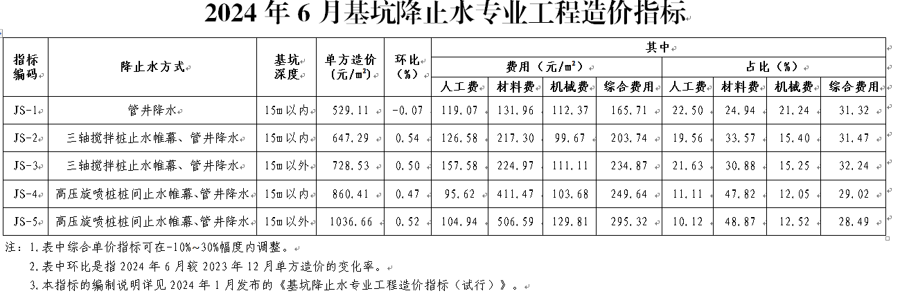 北京市住房和城鄉(xiāng)建設委員會發(fā)布《2024年6月基坑與邊坡支護專業(yè)工程、基坑降止水專業(yè)工程造價指標》