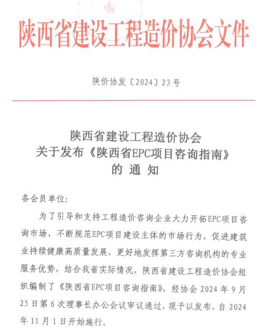 陜西省建設工程造價協會關于發布《陜西省EPC項目咨詢指南》的通知