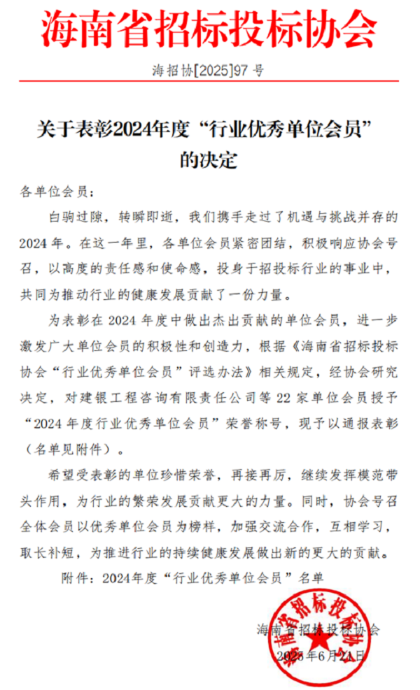 中和德匯作為海南省招標投標協會的首批會員單位,多年來在行業表現優秀,多次獲得協會表彰。近日,我司又再度獲評2024年度行業優秀單位會員,充分體現了行業主管部門和社會各界對我司綜合實力與品牌信譽的高度認可。